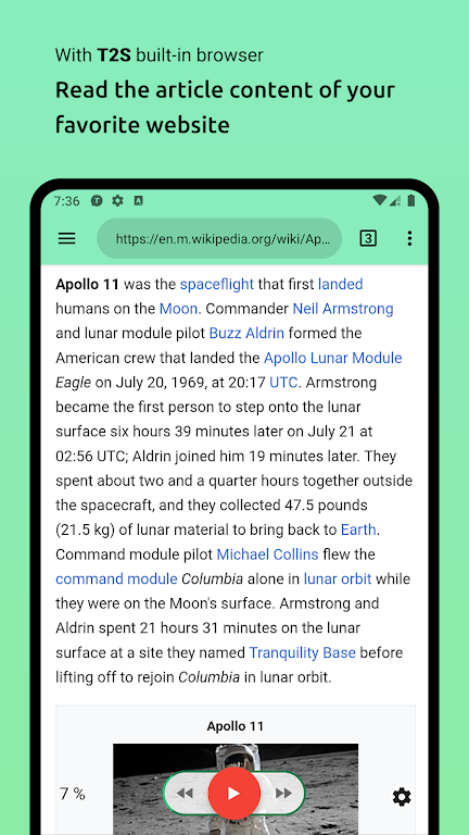 - Integración perfecta entre aplicaciones: La aplicación se integra bien con otras aplicaciones. Utilice la función de compartir para enviar texto o URL a T2S y extraerá el texto de los artículos por usted. También puedes seleccionar texto de otras aplicaciones y pronunciarlo en voz alta. Copie y pegue texto o URL y escuche al instante.