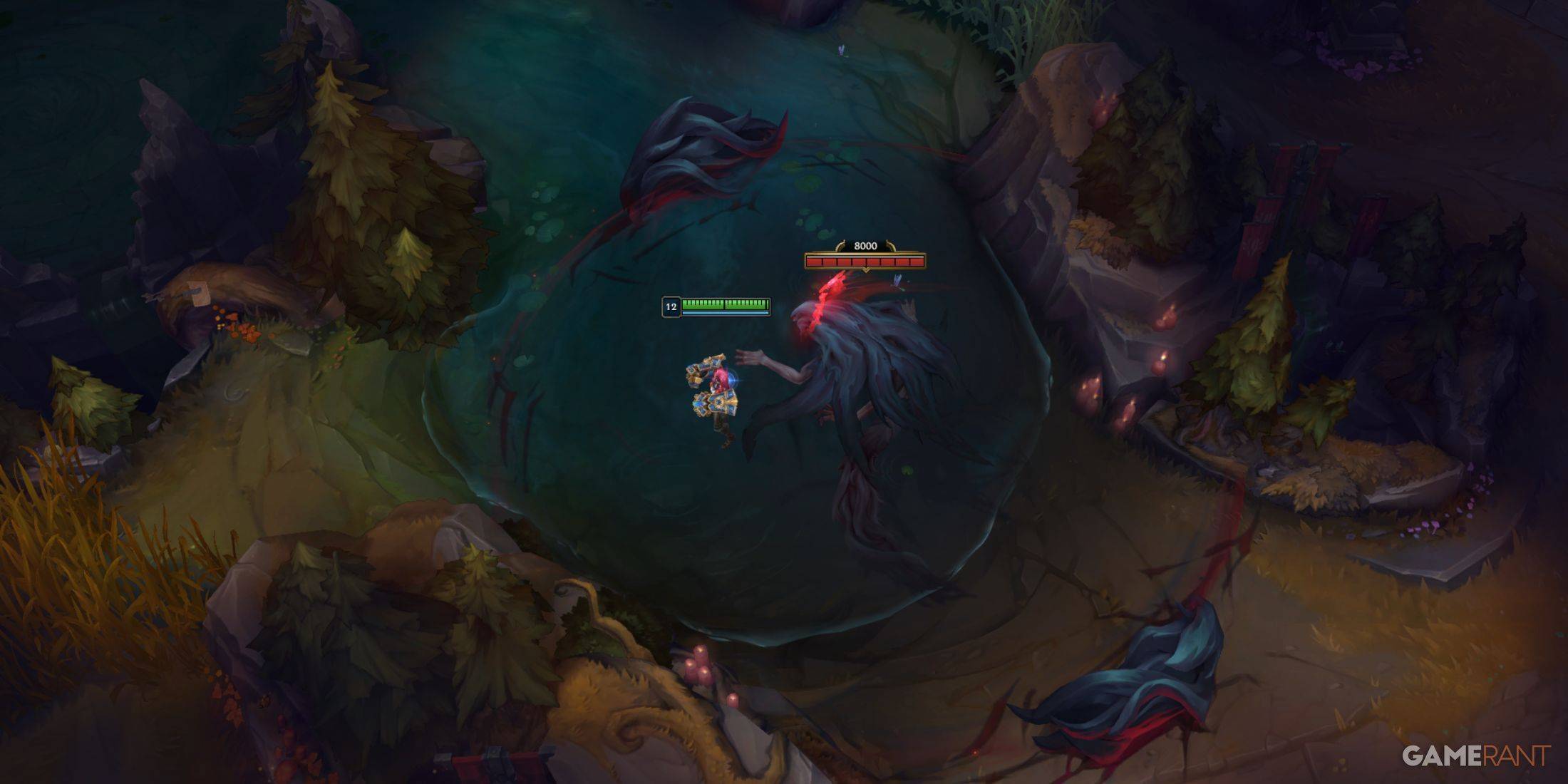 這次史詩般的遭遇的戰場阿塔克(Atakhan's Pit)在河中以14分鐘的成績實現。但是,它的位置取決於遊戲的早期動作。如果在地圖的頂部發生更多的損壞和殺戮,則該坑將出現在頂部車道附近。相反,底部的更多動作將其定位在機器人車道附近。這為團隊提供了一個6分鐘的窗口,以製定戰略和準備對抗。該坑有兩個小的永久牆壁,加劇了阿塔克漢(Atakhan)周圍的小規模衝突。